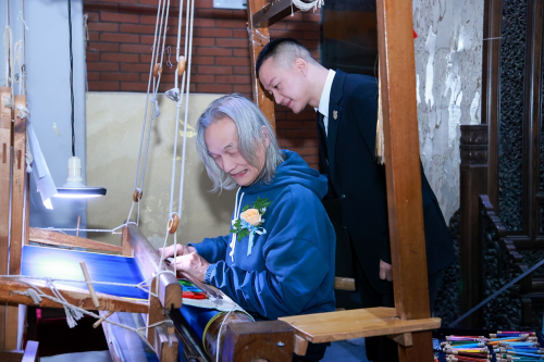云锦大师们不仅是传统技艺的守护者,更是文化创新的推动者。现场,云锦泰斗、云锦设计第一人、国家级传承人郭俊与省级传承人杨玉柱携新作《祥麟天下》《马上大吉》揭幕,以传统纹样融合现代审美,展现“寸锦寸金”的匠心独运。