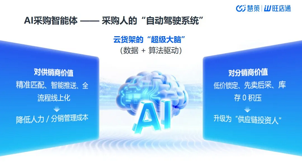 基于十余年零售行业深耕经验,慧策拥有全行业三分之一的订单动销数据、700万+SKU源头条码库及30w+分销商资源。肖彬介绍,这些“数据石油”已被炼化为可重构流通产业的两大核心支柱:“云货架”与“AI采购智能体”。