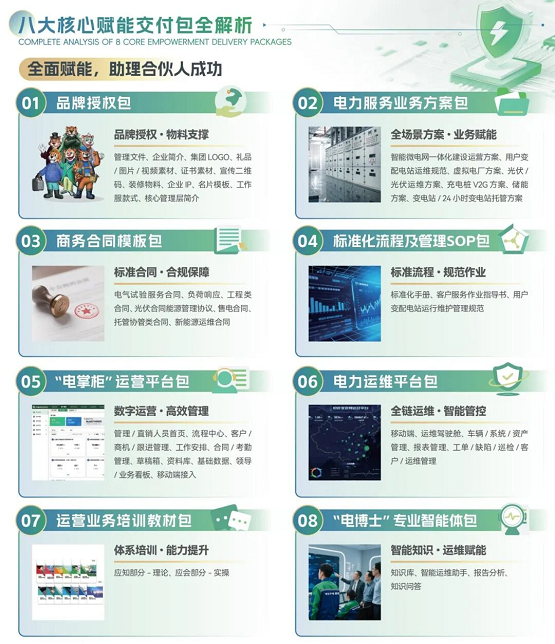针对电力服务行业普遍存在的品牌弱势、技术单一、管理低效、人才匮乏、跨区受限等发展瓶颈,电管家集团打造八大核心赋能交付包,筑基五大赋能体系,助力合伙人全方位破局: